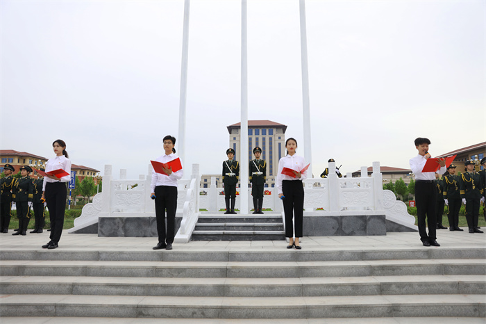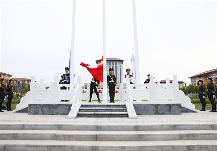 早七时,升国旗仪式正式开始。迎着朝阳,国旗护卫队着装整齐、步伐矫健,护送着鲜艳的五星红旗入场,伴随着雄壮的国歌声,五星红旗冉冉升起,全体师生共同唱响国歌并行注目礼,表达了对伟大祖国的无限热爱与祝福。抬头仰望迎风飘扬的五星红旗,现场师生倍感振奋,无限憧憬中华民族伟大复兴的光明前景。
