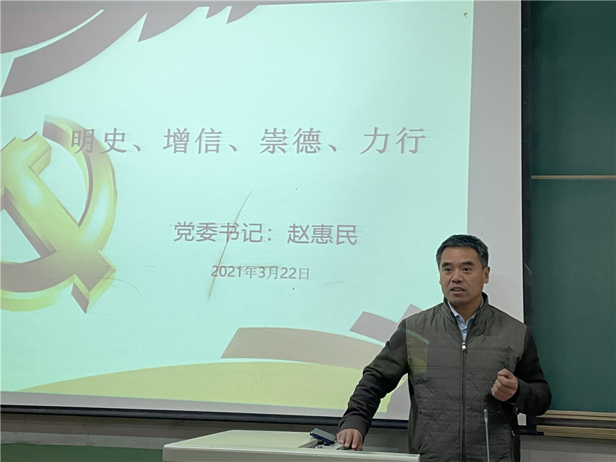3月22日,机械与运载工程学院党委书记赵惠民在机械馆2124讲授题为《明史、增信、崇德、力行》的党史学习教育第一课,学工办主任、相关辅导员和学生代表共同聆听党课,学习党史,重温红色记忆,汲取奋进力量。