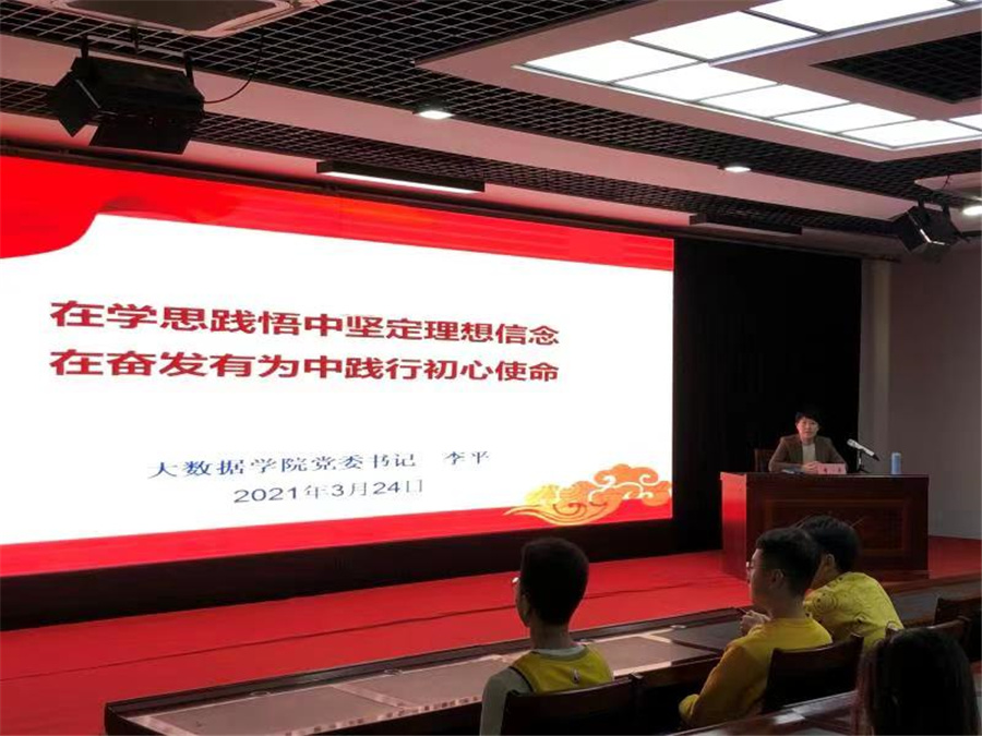3月24日下午,大数据学院举行党史学习教育专题党课,学院党委书记李平以《在学思践悟中坚定理想信念,在奋发有为中践行初心使命》为题开讲“第一课”。会议由学院党委副书记韩福英主持,学院2019级全体学生参加。