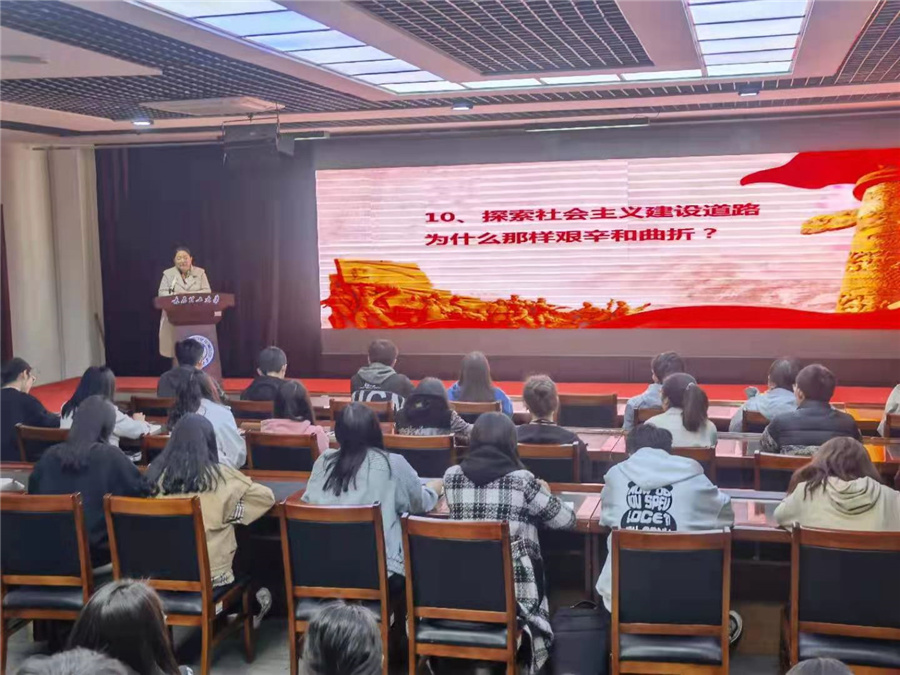 李楠楠以《学党史悟思想,以信仰之光照亮前行之路》为题,从“共产主义是怎样在黑夜沉沉的中国大陆凝聚起一个战斗群体”、“毛泽东为什么选择了‘上山’这条道路”、“中国共产党用什么方法赢得了解放战争的胜利”、“为什么说‘中国人从此站起来了’”、“探索社会主义建设道路为什么那样艰辛和曲折”、“中国共产党要怎样管理好自己”、“进入新时代,治国理政的思想和事件发生了什么样的历史性变化”等多个问题为载体,带领同学们回顾了中国共产党经历的100年的风雨岁月以及在此期间涌现出的许多优秀共产党员的感人事迹。她鼓励同学们要切实增强学习党史的责任感和使命感,弘扬优良传统,砥砺初心使命,书写好建功立业新时代的青春答卷。
