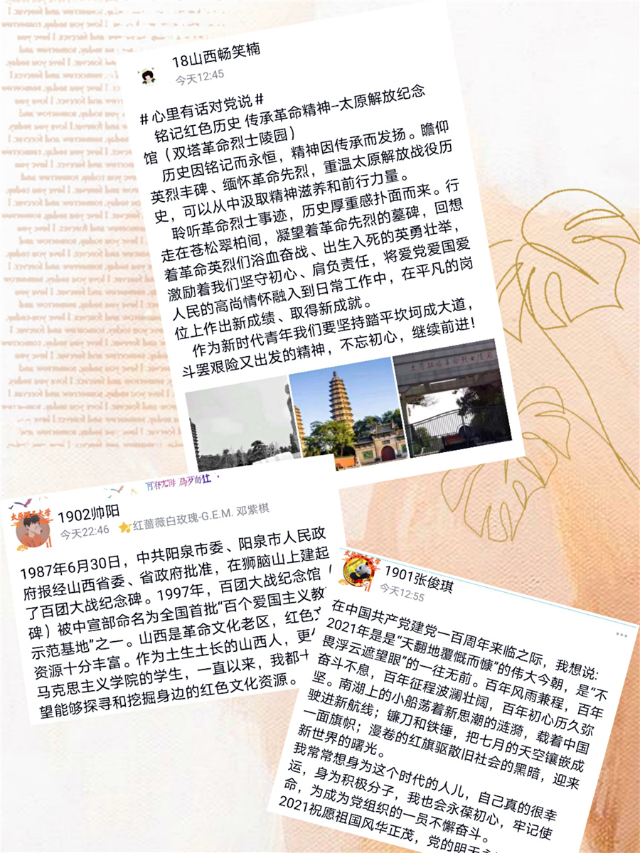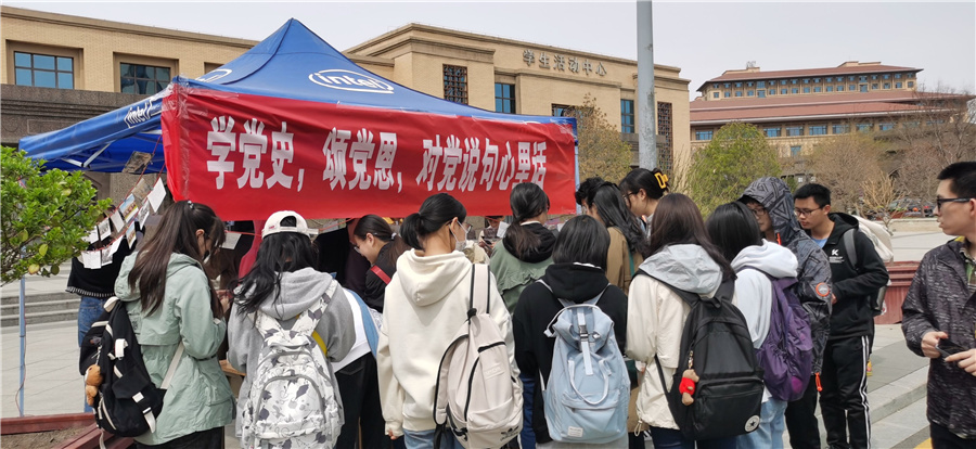 一幅幅随风飘扬的图案展示了中国共产党百年来的历史变迁,一张张手写明信片表达出对祖国和中国共产党的美好祝愿……为庆祝中国共产党成立100周年,向党的百年华诞献礼,4月9日至12日,马克思主义学院团委青年志愿者中心推出了“学党史,颂党恩,心里有话对党说”庆祝中国共产党建党100周年主题教育活动。本次活动由“心里有话对党说”网络云接力和线下送寄语两部分内容组成。