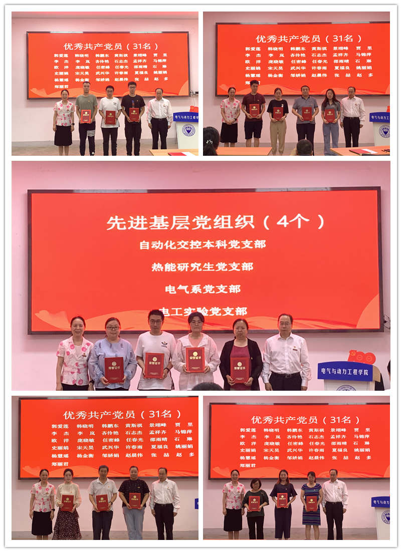 院党委副书记郭春耀宣读了《电气与动力工程学院党委关于表彰“先进基层党组织”和“优秀共产党员”的决定》,党委书记吉育峰、院长韩肖清为先进基层党组织和优秀党员颁发证书。