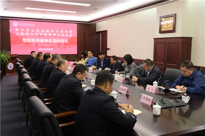 10月9日下午,校武装保卫党支部与晋中市公安局高校分局党委在明向校区行政楼A座312会议室联合举行党组织共建签约仪式。晋中市公安局高校分局党委书记、局长王存江,政委苏维东及其他班子成员;校党委副书记刘润祥、机关党委负责人、武装保卫党支部党员代表等参加了签约仪式。仪式由武装保卫党支部负责人主持。
