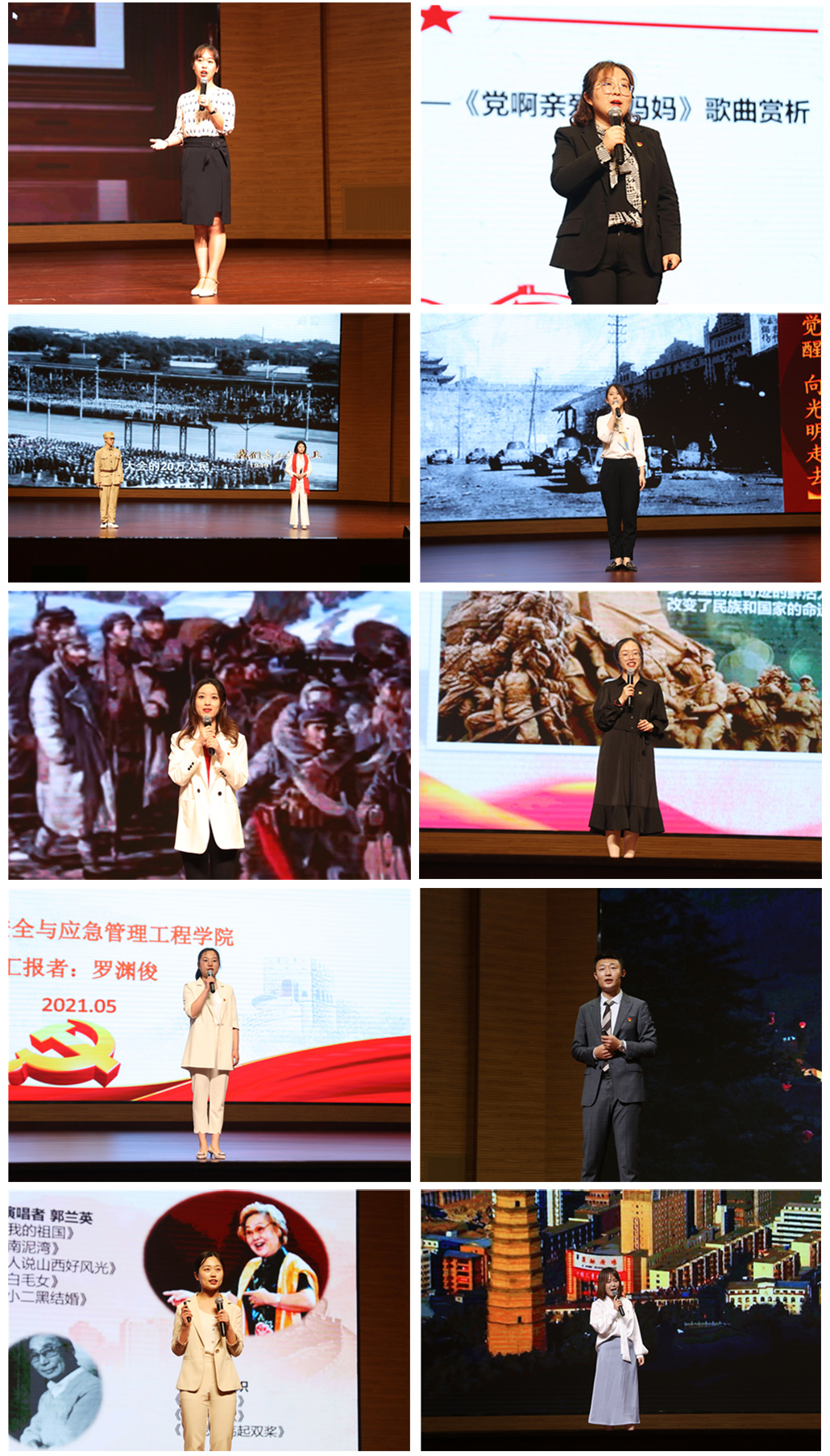 “红船精神”、红色歌曲《党啊亲爱的妈妈》、历史时刻“开国大典”、榜样人物钟南山、经典电影《大会师》、吕梁精神、榜样人物左权、经典电影《古田军号》、红色歌曲《我的祖国》、历史时刻“党的七大”……一段段激情的宣讲感人至深,李大钊最后一次慷慨激昂的演讲、医护工作者面向党旗庄严宣誓……精彩的情景再现把现场师生带入到那过往的峥嵘岁月,大家纷纷表示,将立足党的百年历史新起点,学好党史,深刻感悟思想伟力,铸就信仰之魂,坚定理想信念,矢志拼搏奋斗,汲取奋进力量,让初心融入血脉,把使命扛在肩头,努力成为堪当民族复兴重任的时代新人,让青春在为祖国、为民族、为人民、为人类的不懈奋斗中绽放绚丽之花。