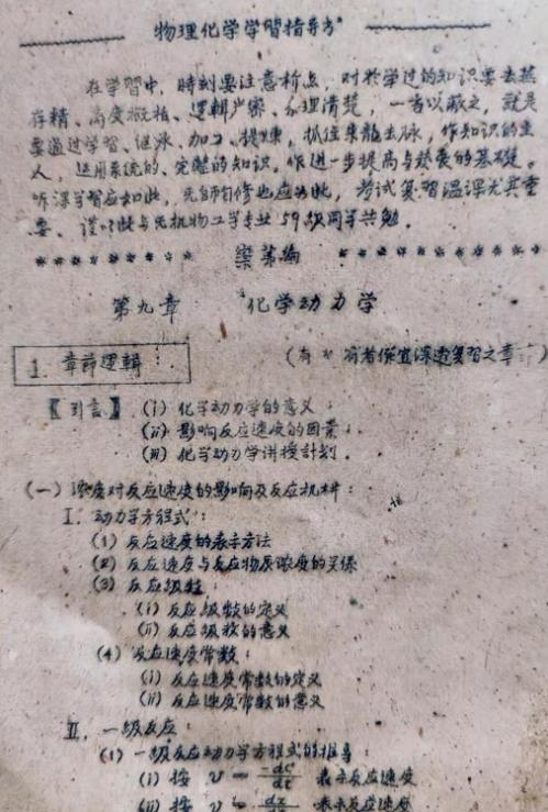 栾茀手工刻印的《物理化学学习指导书》讲义,卷首印有栾茀对无机物工学专业59级同学的学习寄语