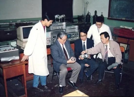 与吴文周教授、张善元教授、博士生韩强、梁非在实验室讨论问题