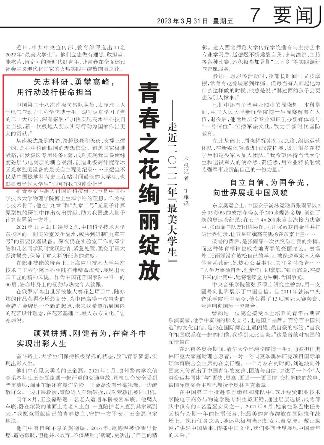 3月31日,浦京2019级博士研究生王煜尘作为10名全国“最美大学生”之一亮相由中宣部、教育部和中央广播电视总台联合主办的《闪亮的名字——2022最美大学生/最美高校辅导员发布仪式》他在南极与祖国连线通过央视镜头向全国观众讲述了他参加极地科考、勇攀科研高峰、把论文写在祖国大地上的成长历程。