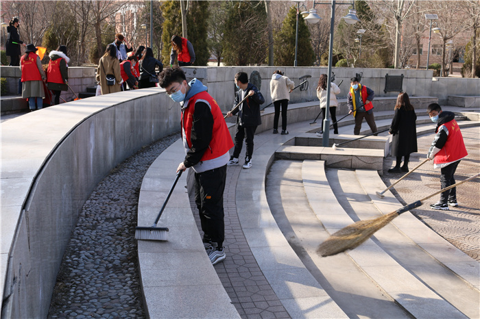 仪式结束后,志愿者们分成两队对迎西校区中西广场进行了清洁维护,一队负责对广场周边的树林、草坪进行清洁整理,另一队负责广场内垃圾清扫和阶梯的清洁。志愿者们认真清理垃圾、打扫杂叶、拾捡烟头、清洁阶梯,在劳动中体会雷锋精神。