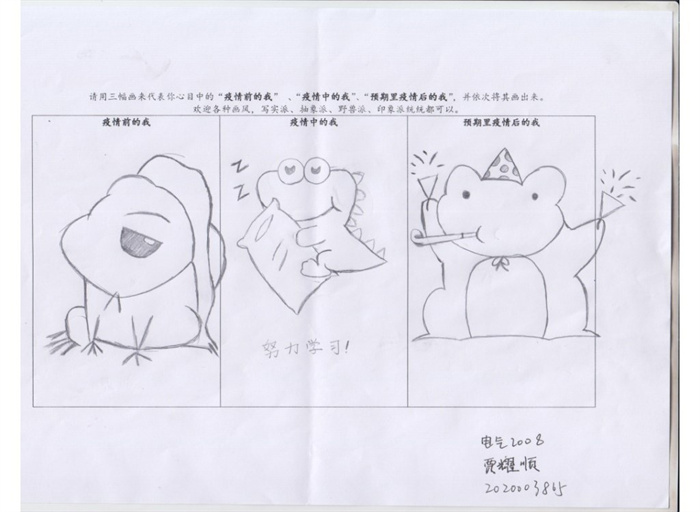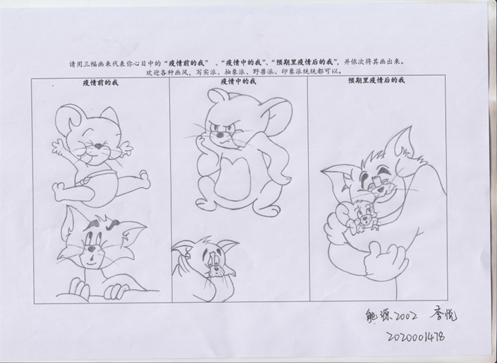 此次绘画征集活动为命题作画,题目为“请用三幅画代表你心目中疫情前、中、后自我的状态”,面向全校范围广泛征集,共收集到线上、线下作品70余幅,绘画作品风格迥异、别出心裁,共评选出优秀作品6幅。