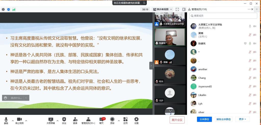 陆建宪从五个方面讲解了如何“从神话看人类命运共同体”,即神话中的人类同生共死、洪水神话的前世今生、人类为何毁灭、谁能成为遗民、人类只有一个地球。最后,陆建宪从人类命运共同体的宏大视角给我们讲解了神话的现代意义。讲解既生动有趣,又发人深省,讲座结束后,在场师生围绕讲座内容与陆建宪进行提问交流,陆教授热情地解答了大家的问题,并从神话的角度给予了同学们学习、工作和生活上的建议。千百年的神话蕴含着人类共同的智慧,正如坎贝尔在《神话的力量》中说,“神话是众人的梦,梦是私人的神话”,神话是民族精神的体现,是集体的创造,如何更好地继承这些宝贵的精神财富并在此基础上创新是青年大学生们应当思考的。