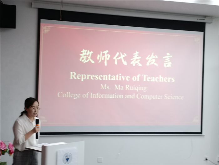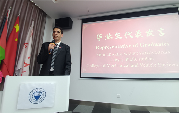 机械与运载工程学院2017级博士研究生ABDULKAREM WALED YAHYA MUSSA(魏力,利比亚籍)作为毕业生代表发言,他深情感谢几年来母校、老师、同学们无私的帮助与指导,并表示将把在中国学到的知识与文化带回自己的国家,为促进中外交流作出应有贡献。信息与计算机学院马瑞青老师作为教师代表发言,她结合自己出国留学、回国工作的经历,勉励同学们要时刻保持拼搏精神和乐观心态,拥抱科学、拥抱生活。