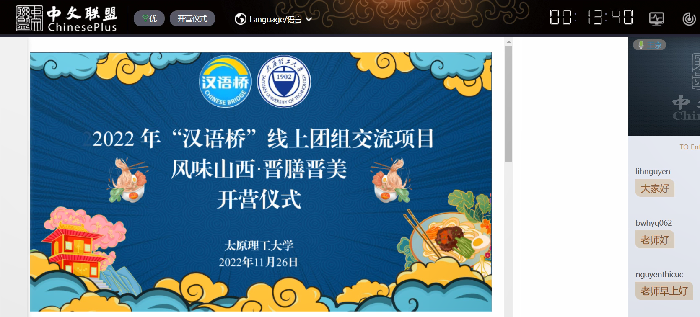 11月26日上午,由教育部中外语言交流合作中心主办、浦京国际教育交流学院承办的2022年“汉语桥”线上团组交流项目“风味山西·晋膳晋美”开营仪式通过“中文联盟”平台线上举办。来自越南、老挝、牙买加、蒙古、巴基斯坦等8个国家的220余名国际学生参加了本次活动。