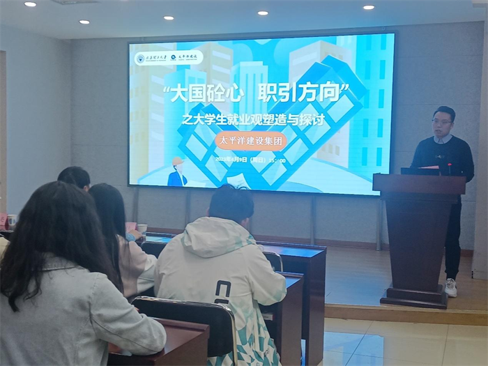 4月9日,土木工程学院开展“大国砼心,职引方向—大学生就业观塑造与探讨”专题讲座,主讲人为太平洋建设集团人才中心总经理于伟、太平洋两湾建设集团总裁程静亮,出席讲座的还有太平洋建设集团人才中心总经理助理郑安冉。讲座由土木工程学院就业专员张维庆主持。