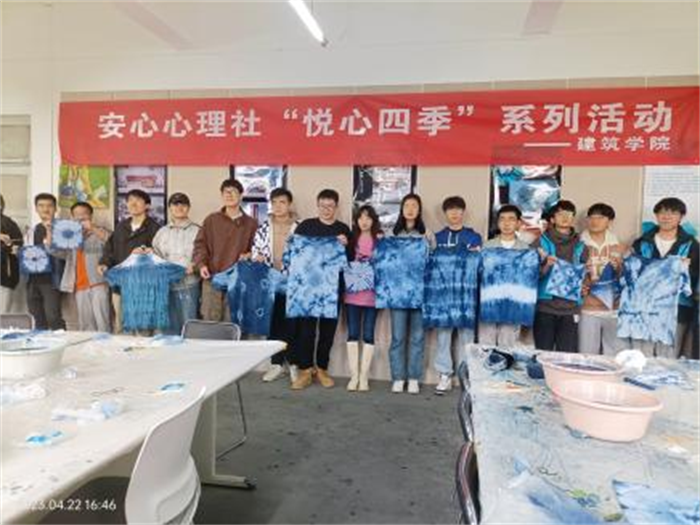 为弘扬民族传统文化,丰富校园文化生活,引导学生树立健康向上的健康心态,建筑学院于4月22日,在迎西校区思韵楼举行主题为“邂逅非遗、扎染美好”的悦心四季系列活动之非遗扎染,吸引了众多师生参与。
