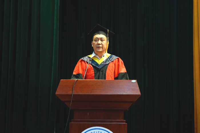院长王志华代表学院向顺利毕业、意气风发的毕业生们送上热烈的祝贺并发表讲话。他回顾了毕业生们在德智体美劳等方面取得的可喜成绩,希望广大毕业生能够不断增强志气、底气和锐气,志存高远、心怀大爱,坚定不移听党话、跟党走,做爱国主义的坚守者和弘扬者,做永不生锈的螺丝钉,以自觉行动报效祖国、回馈社会、服务人民。最后,他向同学们赠言:“愿你们心中有梦,眼里有光,机械学院永远是大家心灵的港湾,常回家看看!”