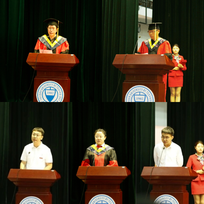 副院长熊晓燕宣读《关于授予2023届博士、硕士、学士学位的决定》。副院长赵敬伟宣读《关于表彰2023届优秀毕业生的决定》。学院为优秀毕业生颁发荣誉证书并赠送“星光台”,希望受到表彰的同学们继续发挥先锋模范作用。马国祯老师作为教师代表发言,鼓励毕业生们将基础研究和工程技术结合,从工程角度造福国计民生。2019级博士生张晶晶、机电1908班裴智明同学代表全体2023届毕业生发言,表达对母校和学院的感恩之情,表示在今后的学习和生活中要踔厉奋发,挺膺担当。