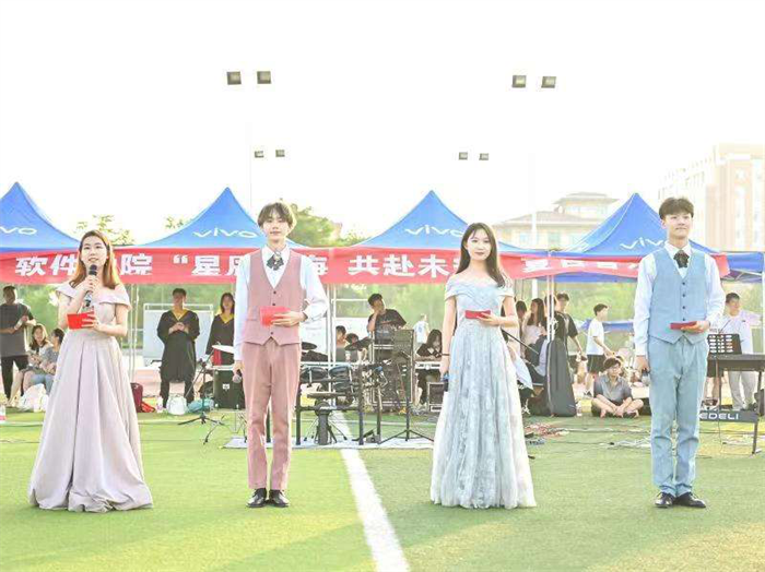 求实创新,韬奋钟声,曾带着我们共同的憧憬;青砖红瓦,碧波绿柳,曾铭记我们共同的回忆。在这个特别的盛夏,软件2020级学生将背负理想与行囊,向着星辰大海,共赴绚烂未来。6月28日晚,软件学院“星辰大海,共赴未来”夏日音乐会在明向校区西操场举办,在场师生欢聚一堂,共同感受这一美好难忘的时刻。校党委学生工作部部长赵国俊、校团委书记史薛伟、软件学院党委书记李栩、院长赵涓涓、党委副书记郭飞、副院长冯秀芳、曹锐以及学院师生参加晚会。
