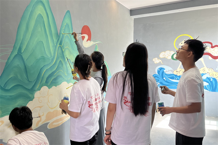 画笔描绘青春,色彩点亮乡村。鹿鸣实践队在张村乡开展了系列墙体美化工作,提升村容村貌,扎实推进美丽乡村、生态家园建设。似火骄阳下,他们设计图案、调配颜料、手持画笔,追逐自己心中的田园。一周多的时间,7幅墙绘和35幅地面绘跃然入目,一面面白墙、一条条小路焕然一新。炫丽的色彩、生动的画作,给村庄带来了更多的生机和灵动。