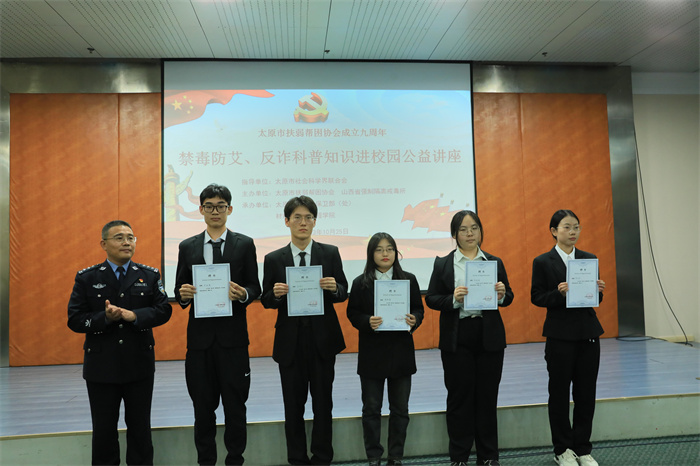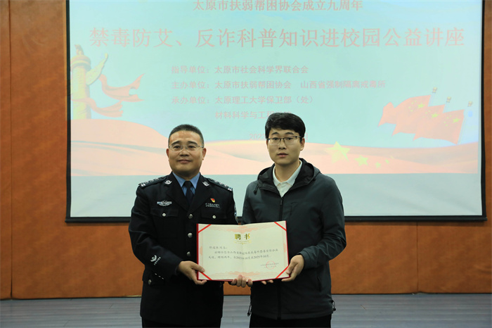 最后,张俊和警官向太原市扶弱帮困协会会长武亮、材料科学与工程学院团委负责人许通陆颁发“禁毒宣传公益大使”聘书,向350vip浦京集团官网学生代表李雨辰、徐钰萌、张恩瑞、高泽天、金骏豪等5位同学颁发“禁毒科普宣传员”聘书。