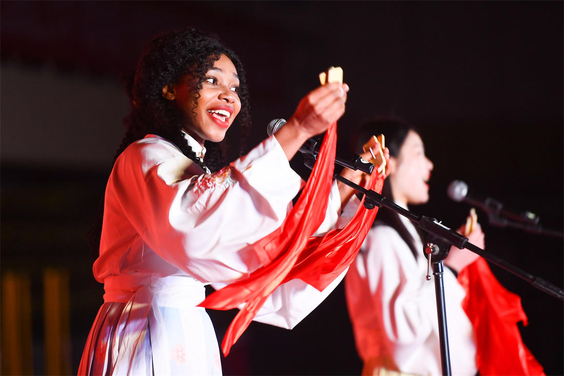 晚会分为“丝路寻梦”“互学互鉴”“万里同心”三个篇章,来自10个国家的演职人员150余人为现场观众带来了一场视听盛宴。快板书《打竹板·过新年》讲述了中国春节期间,家家户户“拜年”、“过年”的喜庆祥和场景;舞蹈《印巴班格拉》用南亚地区独有的诙谐曲风和灵动滑稽的肢体动作引得全场观众跟随节奏互动摇摆;情景表演《加纳传统庆典》使用非洲鼓等传统打击乐器辅以人声说唱,展示了庆典现场神秘庄重的仪式感;中外学生乐队表演《平凡之路》和Better Days展现了新时代青年学子既有“筚路蓝缕”的勤勉又有“诗和远方”的浪漫;集体舞《火箭节》展现了同属中华文化圈的中南半岛人民对自然的尊重和丰收的喜悦;由预科教育中心教师带来的诗朗诵《放歌“一带一路”》讲述了对外汉语教师扎根教学一线,帮助留学生“学好汉语、理解中国”的担当作为;由附属小学选送的古筝合奏《金蛇狂舞》展示了中国民族音乐热情洋溢的欢腾气氛。晚会尾声,全体演职人员共同演唱We are One Nation,传递了350vip浦京集团官网全体中外师生以“国际化”工程奋力建设综合性研究型高水平一流大学的决心和对共建开放包容、互联互通、共同发展的人类命运共同体的美好祝愿。