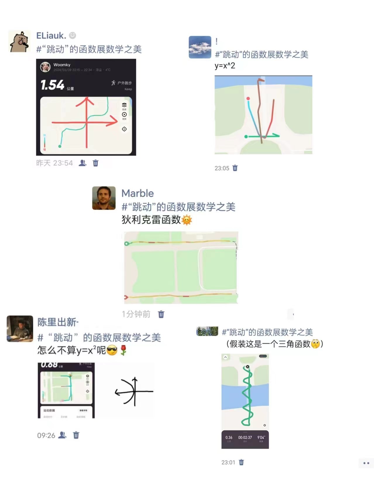 本次活动分为线上和线下两部分活动。线上活动以朋友圈打卡拉开序幕,其形式和内容丰富多样。一段段“三行情‘数’”,同学们用数学思维和数学名词解读自己对生活的感悟,用文字展现数学之美的同时,更是展现出理科生独有的浪漫。值此春天,万物复苏。“‘跳动’的函数”活动让同学们奔跑起来,通过跑步轨迹画出一张函数图像。同学们用一张张函数图像的跑步打卡图展现了青年大学生的蓬勃朝气和无限想象力,同时也在酣畅淋漓的运动中感受着数学的美妙,享受数学的乐趣。