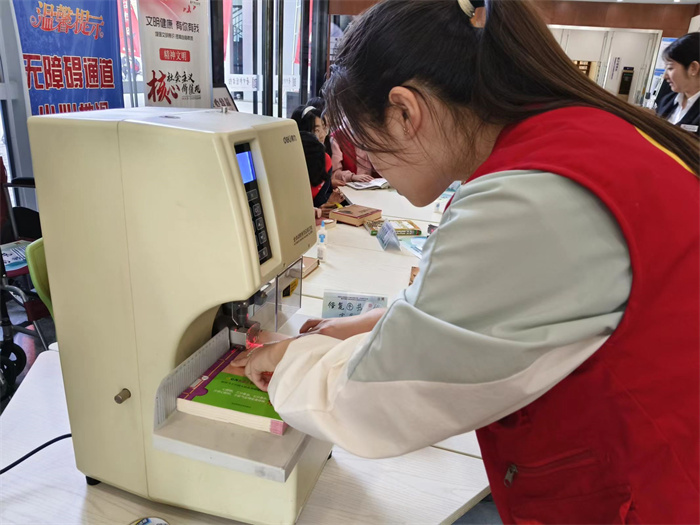 之后,志愿者们便开始着手对损坏程度不同的图书进行逐一修复。在图书修复过程中,志愿者们相互配合,用乳白胶,胶带等工具来修补书皮损坏严重的书籍,对于掉页缺页的书籍,找出掉页缺页的部分,将这些书进行整理,并用专门的打孔装订一体机进行装订。志愿者们也体验了装订机的使用,了解其工作原理,操作技巧和注意事项,将受损的图书“旧貌换新颜”。