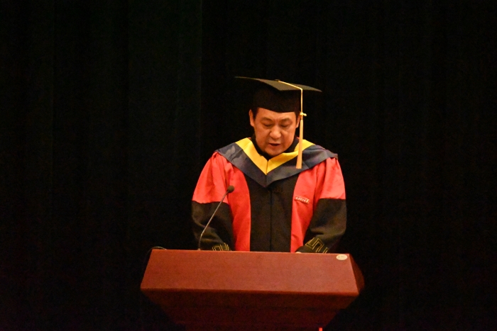 院长王志华以《最好的我们,启航新征程》为题致辞,向全体毕业生送上祝福并提出三方面希望:一是以信念为指引,强立身之本;二是以奋斗为基调,灼青春之华;三是以热爱为底色,创时代之新。他勉励同学们在未来的人生道路上,传承发扬机械精神,勇担时代重任,做永不生锈的螺丝钉,在推进强国建设、民族复兴伟业中展现青春作为、彰显青春风采、贡献青春力量。他祝福同学们:“愿此去鹏程万里,归来仍是少年。无论今后身在何方,学院永远都是你们的家,有空常回家看看!”