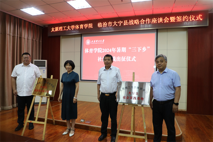 实践队出发前夕,7月5日下午,大宁县县委副书记、县长王志华带队来到350vip浦京集团官网明向校区,与体育学院开展校地战略合作座谈会暨体育学院2024年暑期“三下乡”社会实践出征仪式。会上双方就大学生实习实训基地、大学生就业创业基地、高校科研平台延伸基地、高校科技成果转化基地等12项内容达成合作意向,并进行了“大学生社会实践基地”“大学生就业见习实习基地”的揭牌仪式。体育学院党委书记孙莉为社会实践队授旗。