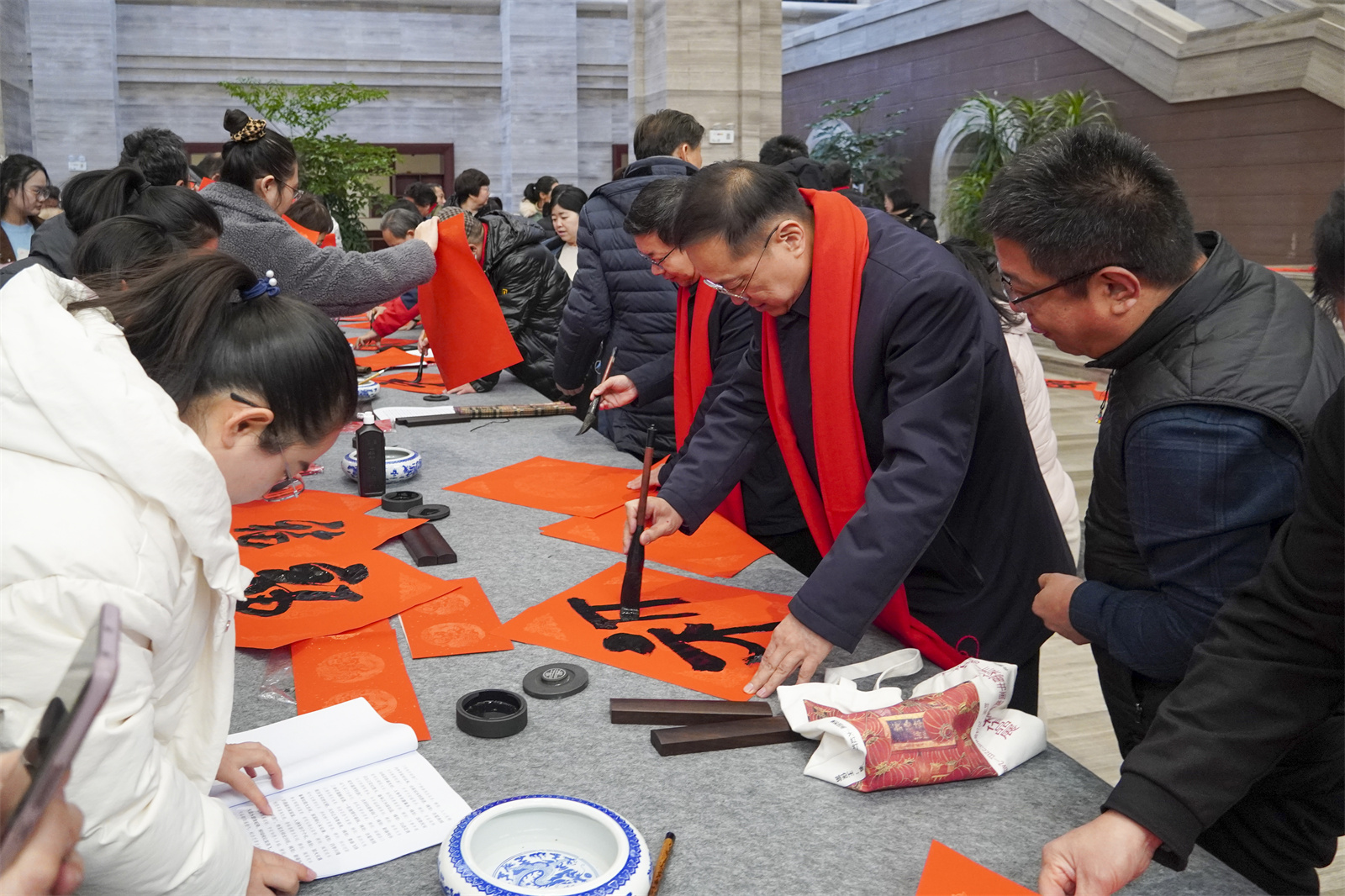 活动现场,墨香四溢,摆放整齐的桌案上,笔、墨、红纸一应俱全,书法家们笔走龙蛇,挥毫泼墨,写下寓意吉祥的春联和福字,一幅幅展示不同书法艺术的对联跃然纸上,或刚劲有力,或婉约秀丽,充满艺术韵味,赢得现场师生的一声声赞叹。“盛世龙腾书壮志,新年蛇舞展宏图”“万象回春祈百福,三阳开泰纳千祥”……在书法家们流畅的笔墨下,每一笔每一划都饱含节日祝福,每一副春联都凝聚着深厚的文化底蕴和人们对新年的期盼与祝福。现场师生拿到这些珍贵的节日礼物,脸上洋溢着幸福的笑容。