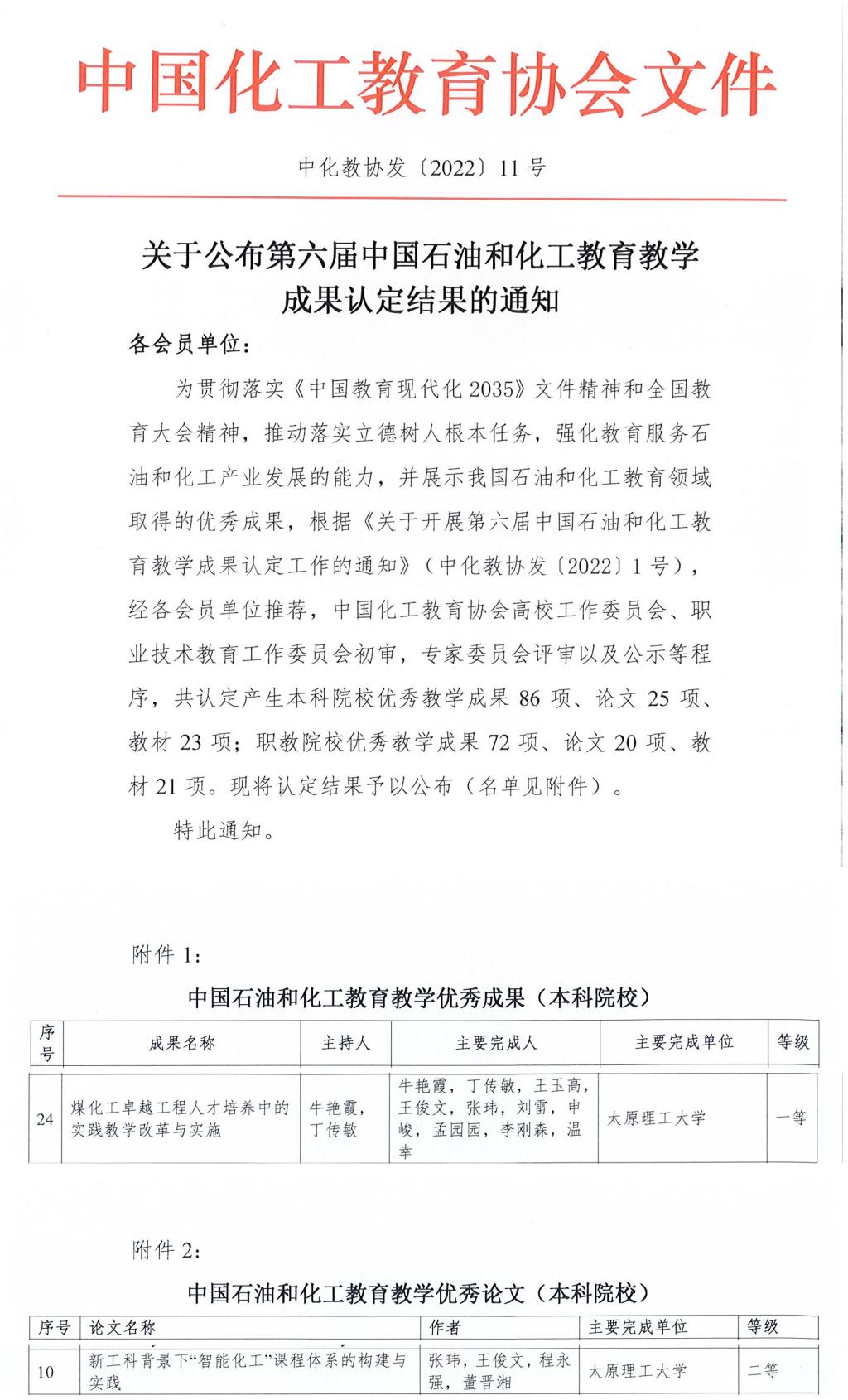 其中,由牛艳霞、丁传敏主持的《煤化工卓越工程人才培养中的实践教学改革与实施》获得优秀成果一等奖;由张玮、王俊文、程永强、董晋湘撰写的《新工科背景下“智能化工”课程体系的构建与实践》获得优秀论文二等奖。