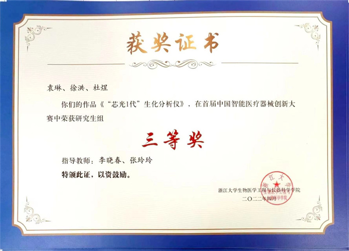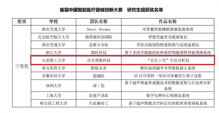 在首届中国智能医疗器械创新大赛中,浦京生物医学工程学院芯光智能团队的参赛作品《“芯光1代”生化分析仪》进入了决赛,最终荣获三等奖。该团队于6月3日收到大赛颁发的获奖证书。