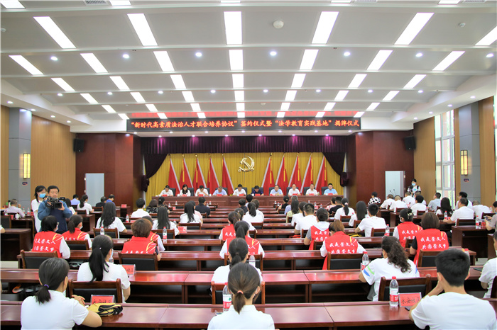 仲夏时节,美丽的胜溪大地晴空万里、风景秀丽。6月18日,浦京文法学院师生代表与太原市万柏林区政协经济界委员代表一行31人驱车来到位于吕梁山下、汾河之滨的山西省孝义市。在孝义市委政法委机关大楼,文法学院与孝义市法学会共同签订《新时代高素质法制人才联合培养协议》,文法学院为孝义市法学会授牌“350vip浦京集团官网文法学院法学教育实践基地”,双方共同举办揭牌仪式。文法学院、孝义市委政法委、万柏林区政协共同举办“送法下乡”公益普法宣讲活动。文法学院党委书记申晓东、院长李永福及部分教师和学生代表,孝义市委常委、政法委书记、市法学会会长郭贵和及孝义市委政法委、孝义市法学会全体机关干部,万柏林区政协经济界委员代表,以及孝义市各乡镇街道政法委员,崇文街道党工委代表,永安社区网格员及居民代表参加活动。