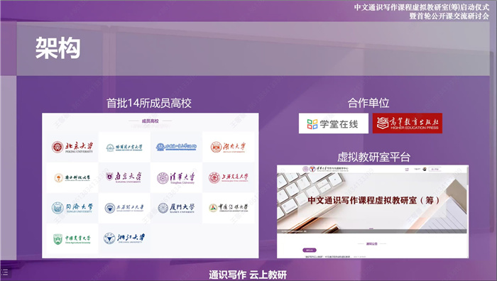 本次“中文通识写作课程虚拟教研室”研讨会分为两个阶段。第一个阶段:11月21日至25日,虚拟教研室成员学校开展线上公开课观摩;第二个阶段:11月26日,虚拟教研室在线召开启动仪式,同时举行首轮公开课交流研讨。