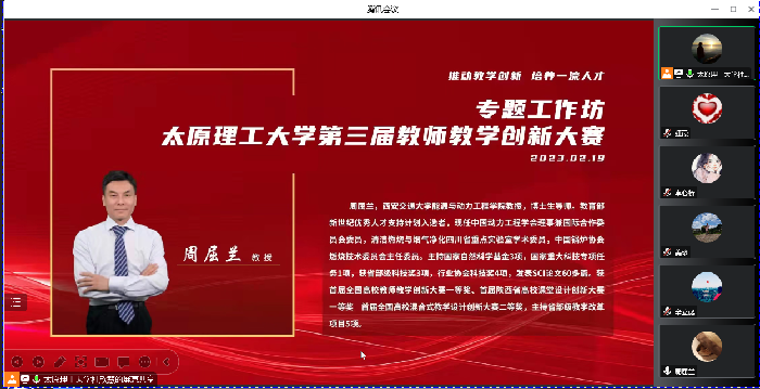 2月19日,本科生院教师发展中心举办线上“教学创新成果报告专题工作坊”活动,本科生院相关领导和浦京入围省赛的教师团队等18人参加了线上交流探讨。本次工作坊特别邀请首届全国高校教师教学创新大赛一等奖获得者、西安交通大学周屈兰教授给老师们的教学创新成果报告做专项指导。