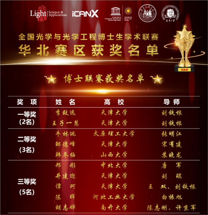 4月14日至16日,由Light: Science & Applications、国际著名科技创新与学术交流平台iCAN、联合国教科文组织“国际光日”组织委员会联合主办,天津大学、河北工业大学联合承办的2023年全国光学和光学工程(华北赛区)博士生学术联赛在河北工业大学成功举办。