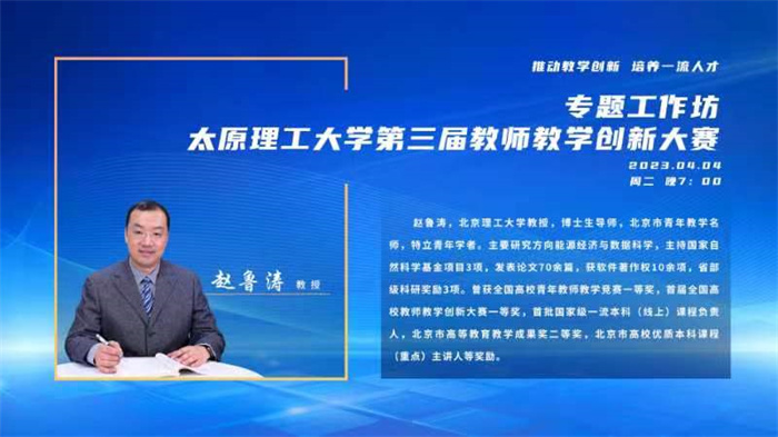 4月4日,本科生院举办线上“教学创新汇报”专题工作坊活动,本科生院相关领导和浦京入围省赛的教师团队等20余人参加了线上培训,活动由本科生院教师发展中心副主任杜欣慧主持。本次工作坊特别邀请首届全国高校教师教学创新大赛一等奖获得者、北京理工大学赵鲁涛教授分享教师教学创新大赛备赛经验并进行指导。