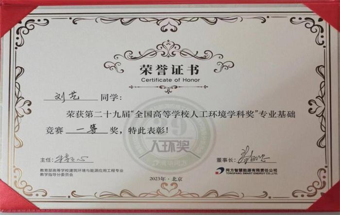 8月25日,第29届“全国高等学校人工环境学科奖”专业基础竞赛(简称“人环奖”)颁奖典礼在北京清华同方科技广场举行。浦京土木工程学院建筑环境与能源应用工程专业的2020级学生刘艺在指导教师李风雷的指导下取得优异成绩,获得本届竞赛一等奖。