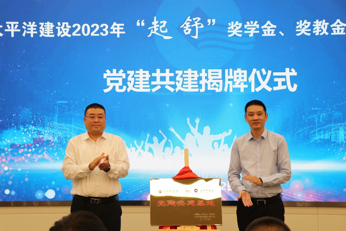 颁奖仪式上,武佐君作为学院代表和太平洋建设集团代表张云山共同为院企党建共建基地揭牌。