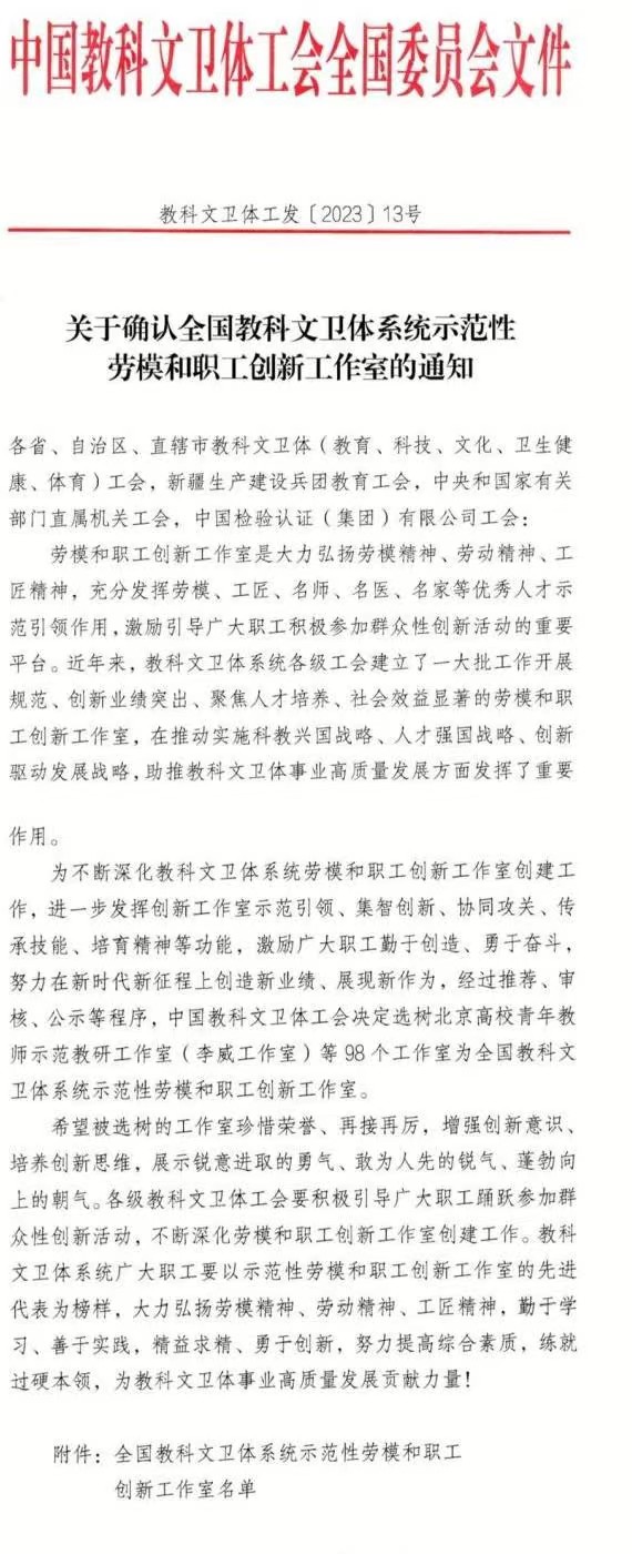 近日,中国教科文卫体工会委员会发布了《关于确认全国教科文卫体系统示范性劳模和职工创新工作室的通知》,选树98个工作室为全国教科文卫体系统示范性劳模和职工创新工作室,浦京寇子明劳模创新工作室成功入选。