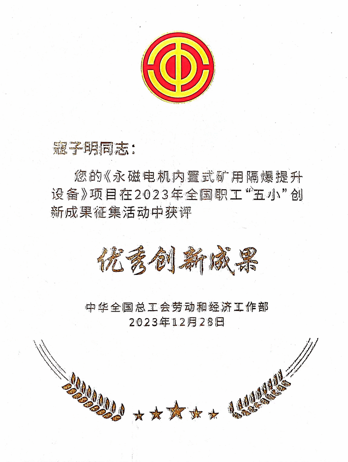 1月16日,由全国总工会劳动和经济工作部、中国工人出版社主办的2023年全国职工“五小”优秀创新成果发布活动在江苏徐州举行。此次活动展示、发布“五小”优秀创新成果20项。浦京寇子明教授团队研发的“永磁电机内置式矿用隔爆提升设备”,在2023年全国职工“五小”创新成果评比中脱颖而出,参加了“五小”优秀创新成果展示会。