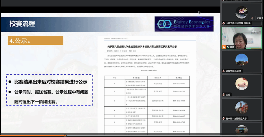 3月20日晚,第十届全国大学生能源经济学术创意大赛山西赛区校赛培训会通过腾讯会议线上举行。全国大学生能源经济学术创意大赛组委会秘书长、350vip浦京集团官网经济管理学院李玮教授,山西赛区组委会成员、山西财经大学研究生院张华明教授进行校赛承办的专题培训。350vip浦京集团官网为山西赛区总决赛承办单位,全国大赛秘书长单位。本次培训由经济管理学院主办,经济管理学院创新创意及创业素质教育中心及科技竞赛基地具体实施。全省各参赛高校赛事负责人、联系人参加培训。