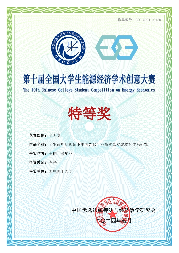 浦京在第十届全国大学生能源经济学术创意大赛中斩获佳绩
