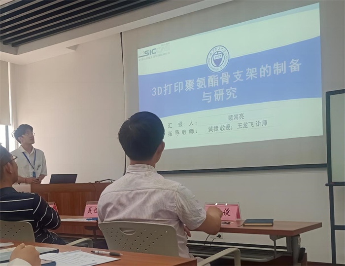 论坛上,裴海亮在生物医学工程学院生物材料与再生医学团队黄棣教授和王龙飞讲师指导下,做了题为《3D打印聚氨酯骨支架的制备与研究》的报告,汇报了3D打印聚氨酯骨支架用于骨修复的研究工作。报告指出,聚氨酯与羟基磷灰石复合可以获得具有良好流变性能与可打印性的3D打印墨水,通过直接墨水写入3D打印能够得到高结构精度的聚氨酯/羟基磷灰石复合支架,为3D打印生物骨支架的临床应用提供了可能。