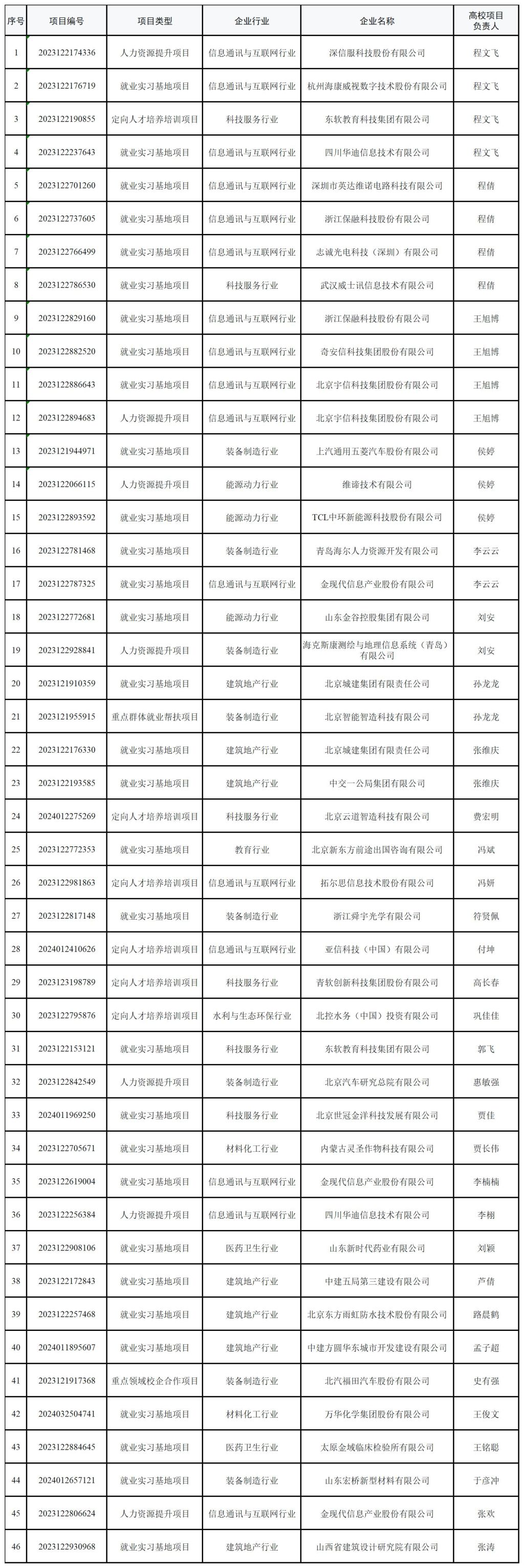 近日,教育部印发了《关于公布教育部第三期供需对接就业育人项目立项名单的通知》(教就业司函〔2024〕23号),文件公布了教育部第三期供需对接就业育人项目立项名单。 浦京共有46个项目获批立项,居全省高校首位,其中,就业实习基地项目31项,定向人才培养培训项目6项、人力资源提升项目7项,重点领域校企合作项目1项,重点群体就业帮扶项目1项。