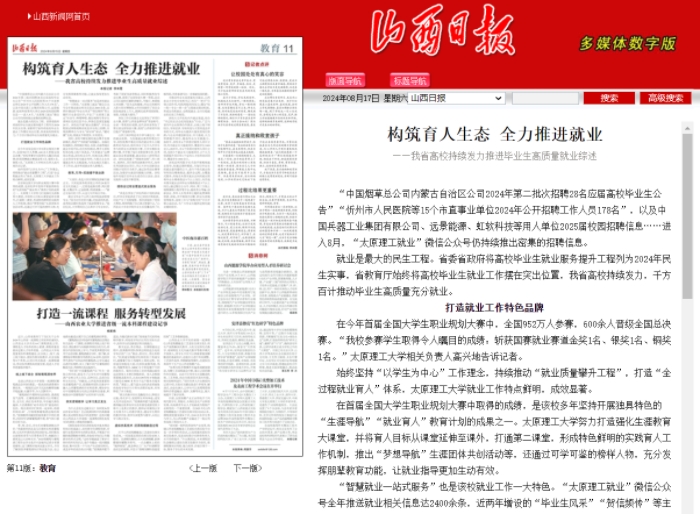 8月17日,《山西日报》第11版在《构筑育人生态 全力推进就业——我省高校持续发力推进毕业生高质量就业综述》文章中,围绕“打造就业工作特色品牌”报道了浦京就业工作。今年以来,浦京始终坚持“以学生为中心”工作理念,持续推动“就业质量攀升工程”,打造“全过程就业育人”体系,学就业工作取得显著成效。