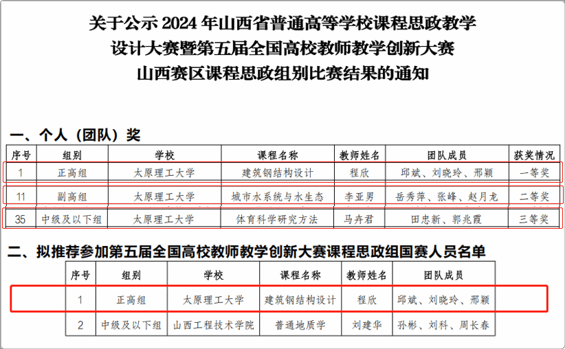 11月24日,“2024年山西省普通高等学校课程思政教学设计大赛暨第五届全国高校教师教学创新大赛山西赛区课程思政组比赛”在中北大学圆满落幕。经过激烈角逐,浦京土木工程学院程欣、李亚男,体育与健康工程学院马卉君三个教师团队分别获正高组一等奖、副高组二等奖、中级及以下组三等奖,其中,程欣教师团队以省赛第一名的成绩晋级第五届全国高校教师教学创新大赛课程思政组国赛。