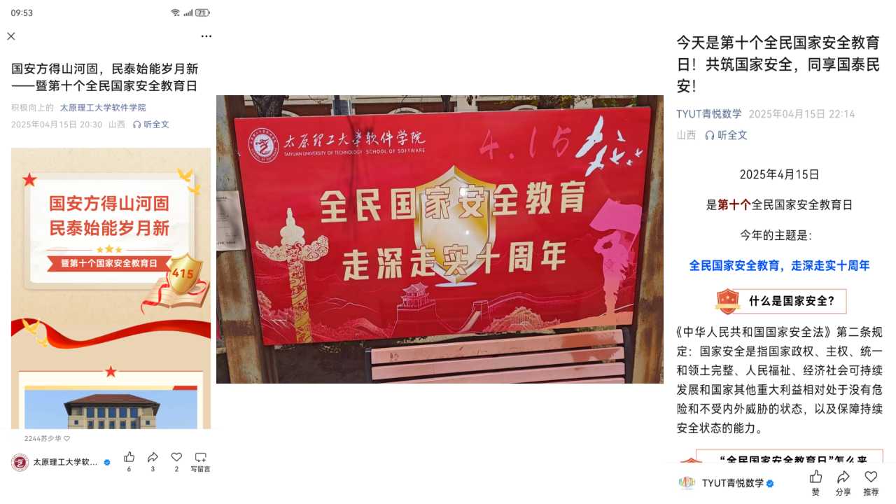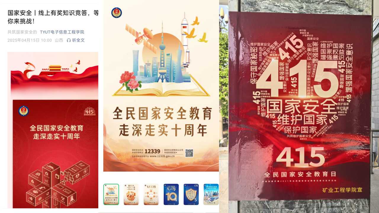在线上宣传方面,材料科学与工程学院、环境与生态学院、集成电路学院、建筑与艺术学院、软件学院等学院充分利用新媒体传播优势,强化宣传矩阵,营造浓厚氛围构建“线上+线下”宣传矩阵,多维度强化国家安全教育。及时发布国家安全相关知识和政策法规。开设国家安全知识专栏,通过图文并茂的海报、生动有趣的短视频、“4•15”文艺作品评选活动等形式,将晦涩难懂的国家安全知识转化为学生喜闻乐见的内容。在线下宣传方面,矿业工程学院、化学与化工学院等学院设置国家安全宣传标语、展板、宣传栏,营造浓厚的宣传氛围。