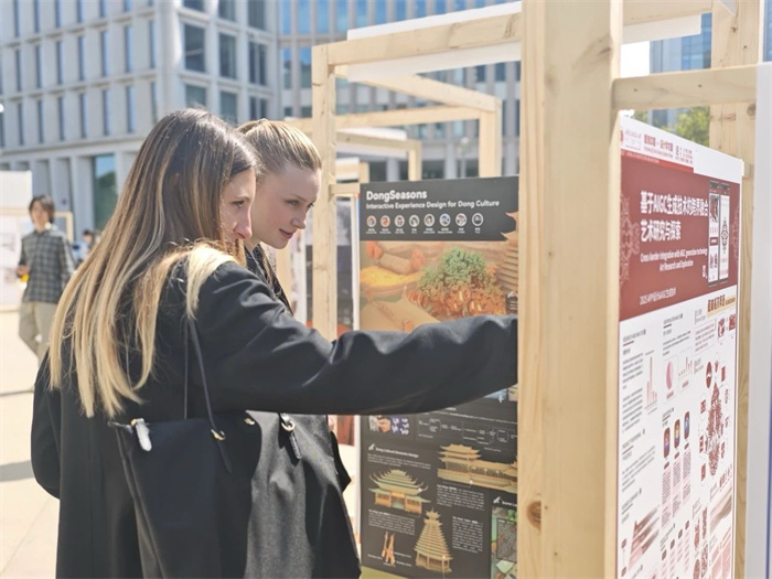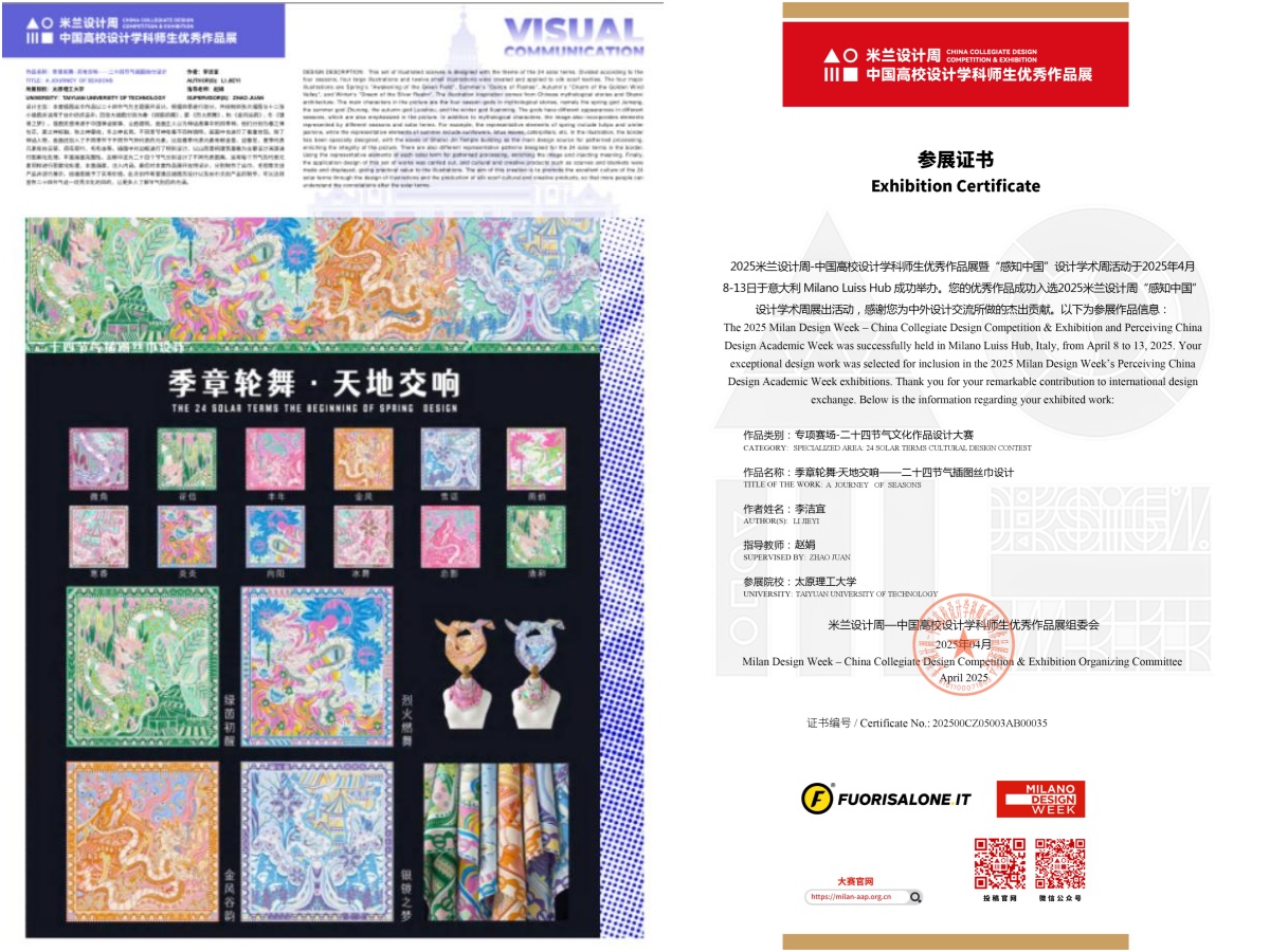 此次赴米兰设计周展出的中国高校师生优秀作品近150件,浦京学生李洁宜同学的作品《季章轮舞·天地交响》有幸成为此次展出的优秀作品之一。此次参展作品涵盖了视觉传达设计、产品设计、环境空间等多个类别,充分展示了中国设计教育的丰硕成果,有力推动了中意欧设计教育领域的交流与合作。展出现场吸引了众多国际观众欣赏讨论。