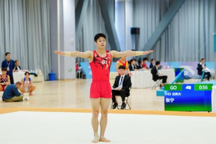 在个人全能比拼中,郭维强展现出扎实的技术功底和稳定的竞技心态。面对对手的高难度动作挑战,他在自由体操、鞍马、吊环、跳马、双杠、单杠六个项目中稳扎稳打,每一套动作都力求精准规范,最终以均衡的表现拿下个人全能第三名。更值得称道的是,他在鞍马、吊环、跳马、双杠四个单项中均发挥出色,全部跻身前三名,成为本次赛事中为数不多的“多面”选手。现研究生就读于北京体育大学的张宁(体育与健康工程学院2024届毕业生)则延续了在本科期间的优良训练状态,凭借对动作细节的精准把控和丰富的赛场经验,在强手如林的全能赛场中位列第六,用实力印证了浦京体育教育专业人才培养的扎实成效。
