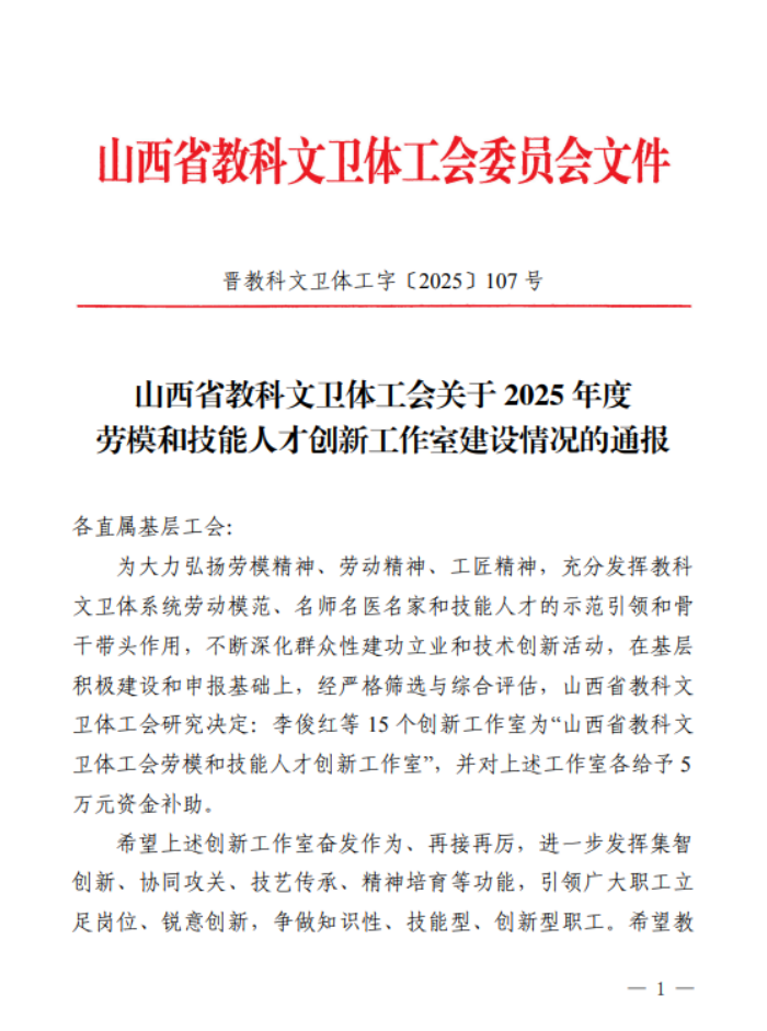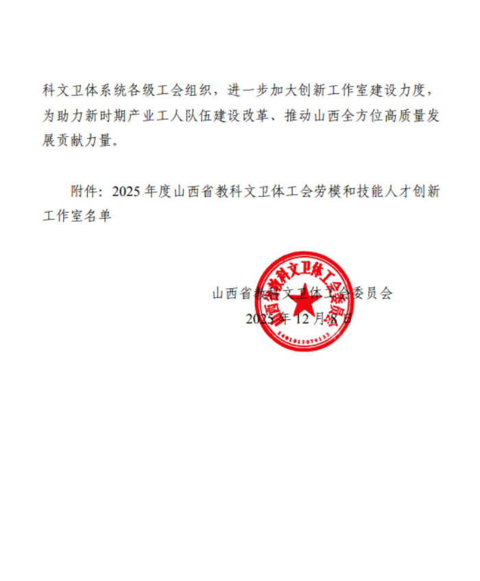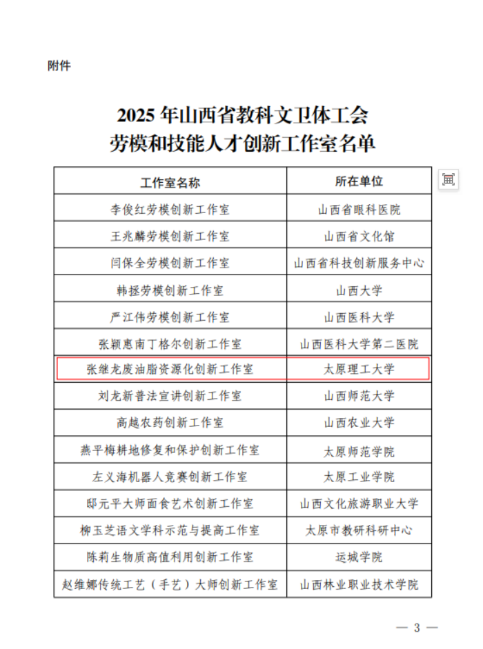 近日,山西省教科文卫体工会下发《山西省教科文卫体工会关于2025年度劳模和技能人才创新工作室建设情况的通报》,浦京张继龙废油脂资源化创新工作室被命名为“山西省教科文卫体工会劳模和技能人才创新工作室”。